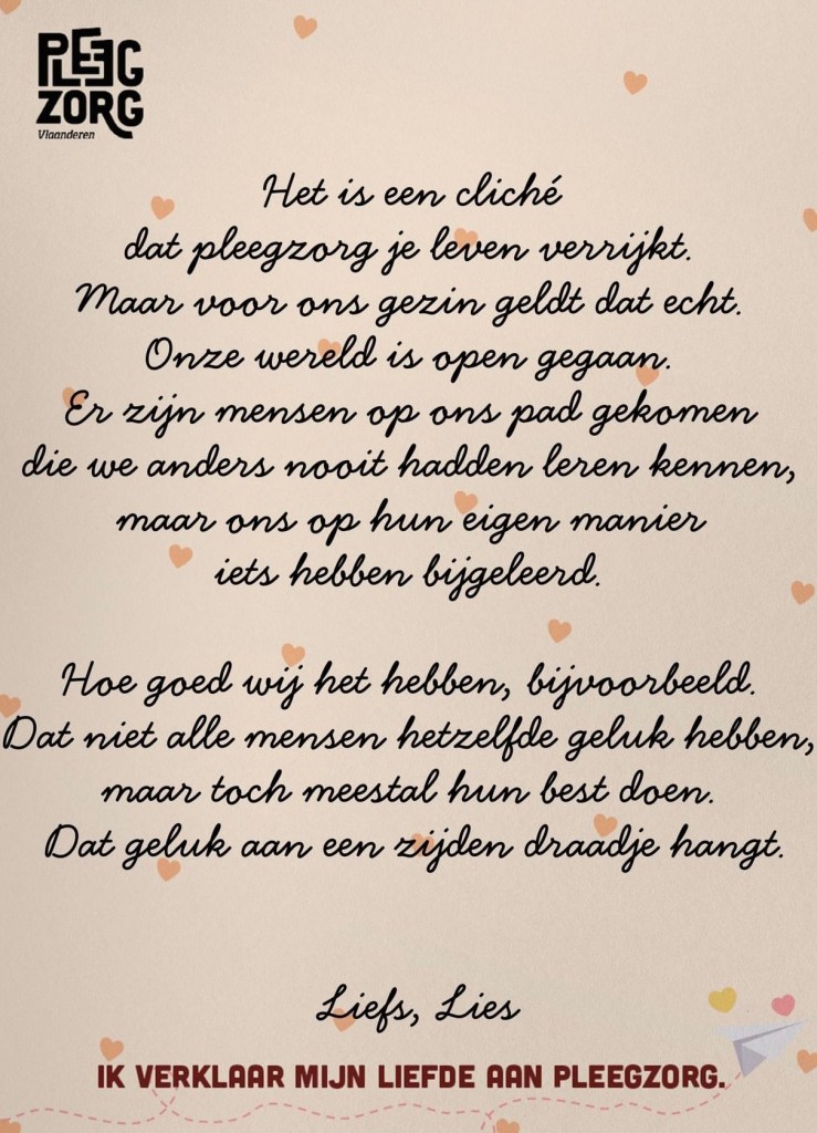 10 jaren zijn voorbij gevlogen. Het liep niet altijd van een leien dakje, maar pleegzorg was er steeds om ons bij te staan. Soms was dat slechts een babbeltje waarin we ons hart eens konden luchten. Soms was er meer nodig en schoot een heel team in actie. Dat maakt dat het wat ons betreft 10 hele mooie jaren waren waarin elke hindernis vlotjes genomen werd.